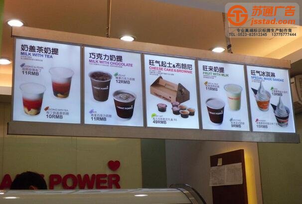 奶茶灯箱:广泛使用于各式特色饮料店,特色小吃店等,用于广告宣传、产品及价格展示、销售信息、各类告示等。
